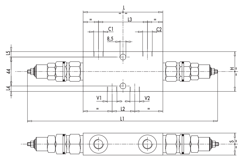 Соедините V1 и V2 c гидрораспределителем, С1 и С2 к порту гидроцилиндра.